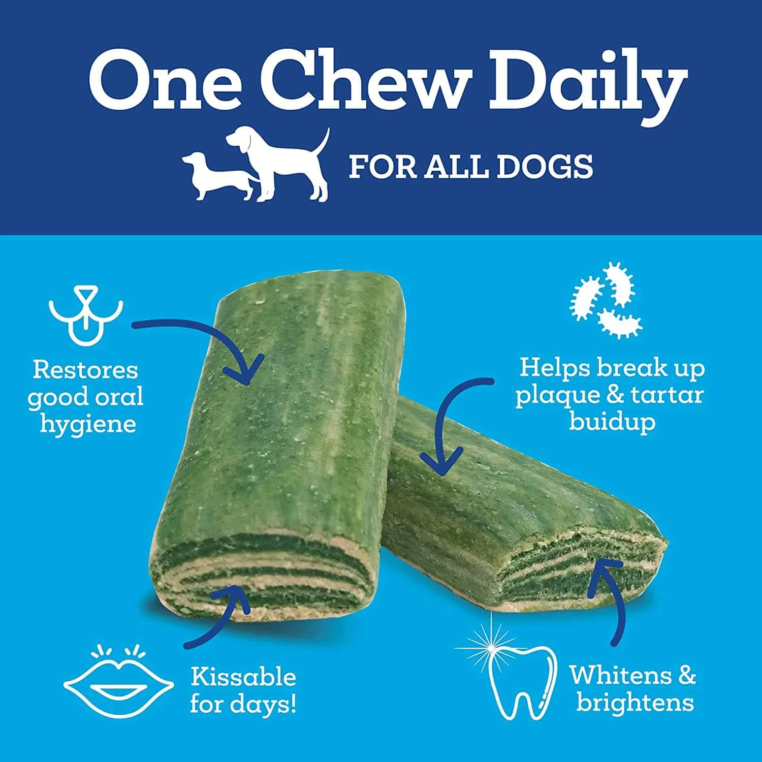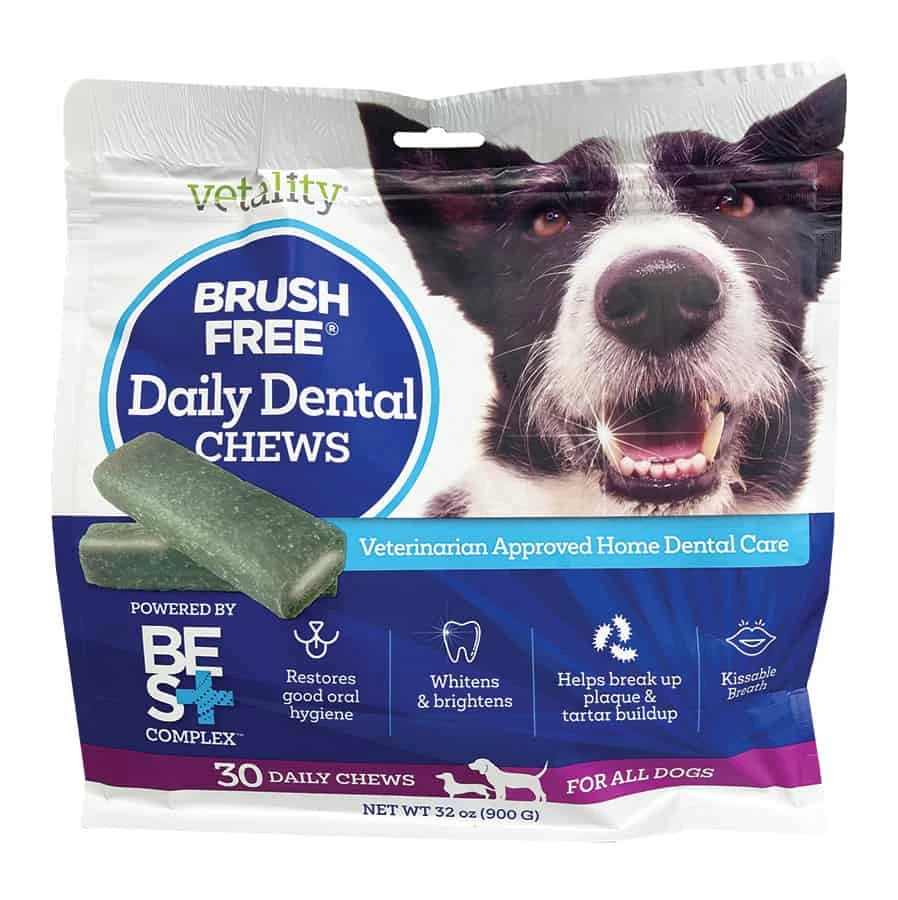 Treat your dog to good oral health! Vetality Brush Free Daily Dental Chews, powered by BEST Complex, are a veterinarian approved home dental care solution that restores good oral hygiene in dogs. It’s easy, and it works. Just give one a day to your dog for whiter & brighter teeth, to break up plaque & tartar build up & for kissable minty fresh breath. Healthy mouth. Healthy Dog.