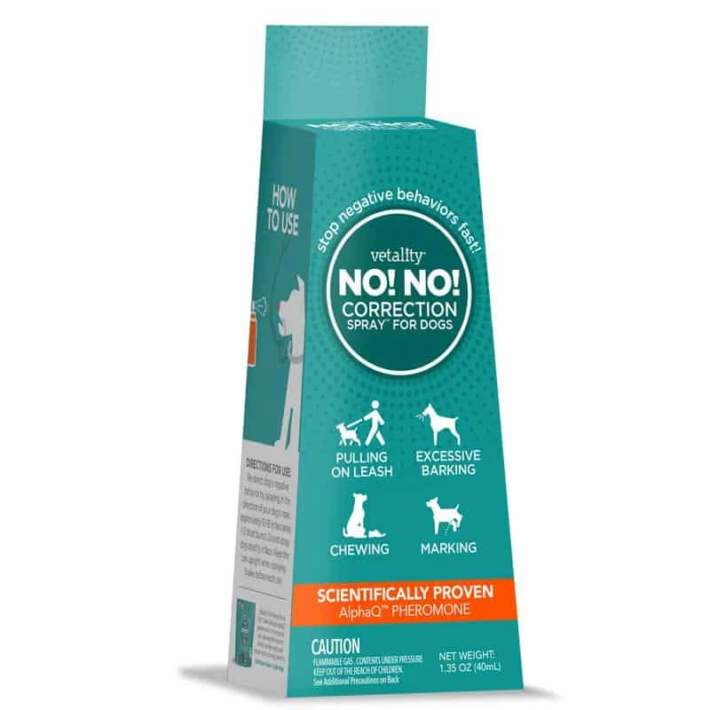 Vetality No! No! Correction spray for dogs works by combing AlphaQ®, a behavior modification pheromone, with an attention-getting sound in an easy-to-use spray.