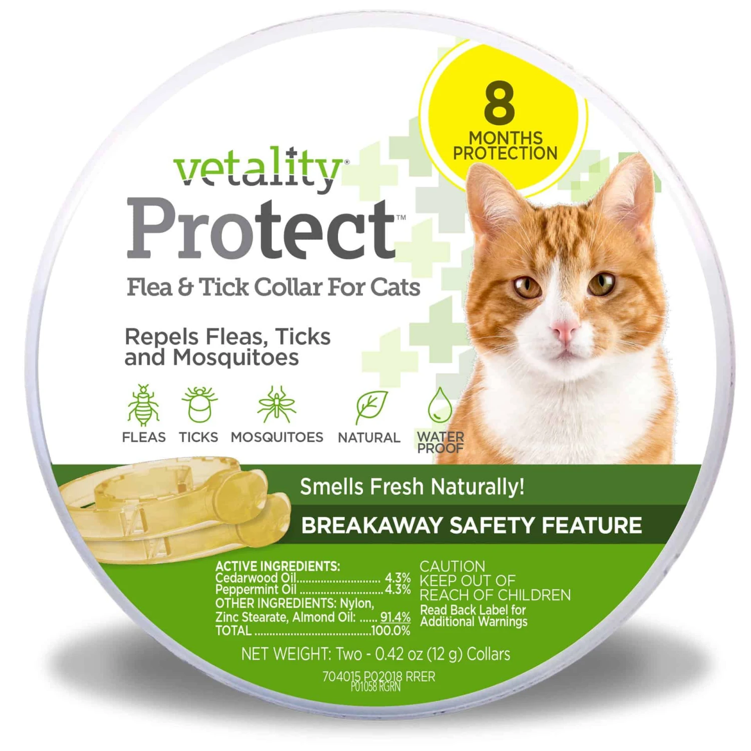 Vetality® Protect™ Flea & Tick Collar for Cats offers a proprietary blend of botanical oils to protect your cat by repelling fleas & ticks for 4 months and repels mosquitoes. Long-lasting, 8 months protection with 2 collars. These collars are Phthalate & PVC free and include a breakaway safety feature. Safe for use around children and pets, when used as directed. For cats & kittens 6 months or older.