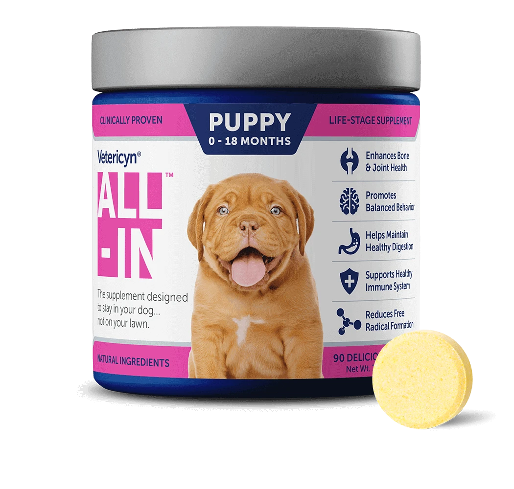 - Vetericyn All-In is the only life-stage supplement that combines age-specific, patented complexes with a delivery system that transports vital ingredients and unlocks the dog’s cells so they get used by the body in the right amounts. It’s complete and balanced bio-replenishment, all in one simple tablet. Formula made for dogs ages 0 – 18 months.