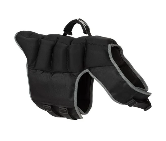 - This slim-fitting canine swim vest features neoprene-filled pockets that offer the perfect combination of buoyancy and flexibility. Water-resistant, rip-stop 2520D ballistic poly exterior for durability and performance without being bulky. Comfortable, padded handle gives you great grip when pulling your dog from the water. Neck closure with quick-release buckle adjusts for a precise fit. Two adjustable belly straps with quick-release buckles ensure a secure, snug fit.