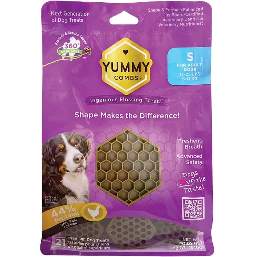 Cleaning your dog’s teeth has never been easier or more nutritious. Yummy Combs® dog treats work like dental floss for a more complete cleaning than other dental doggie snacks. With 44% high-quality protein and 12 other wellness ingredients packed into a highly functional shape, you can feel good about giving this treat to your dog every day. Best of all, dogs love the taste! This formula contains 44% superior quality animal protein. Includes 38 ingredients that are all natural, grain free, NON-GMO and Gluten Free.