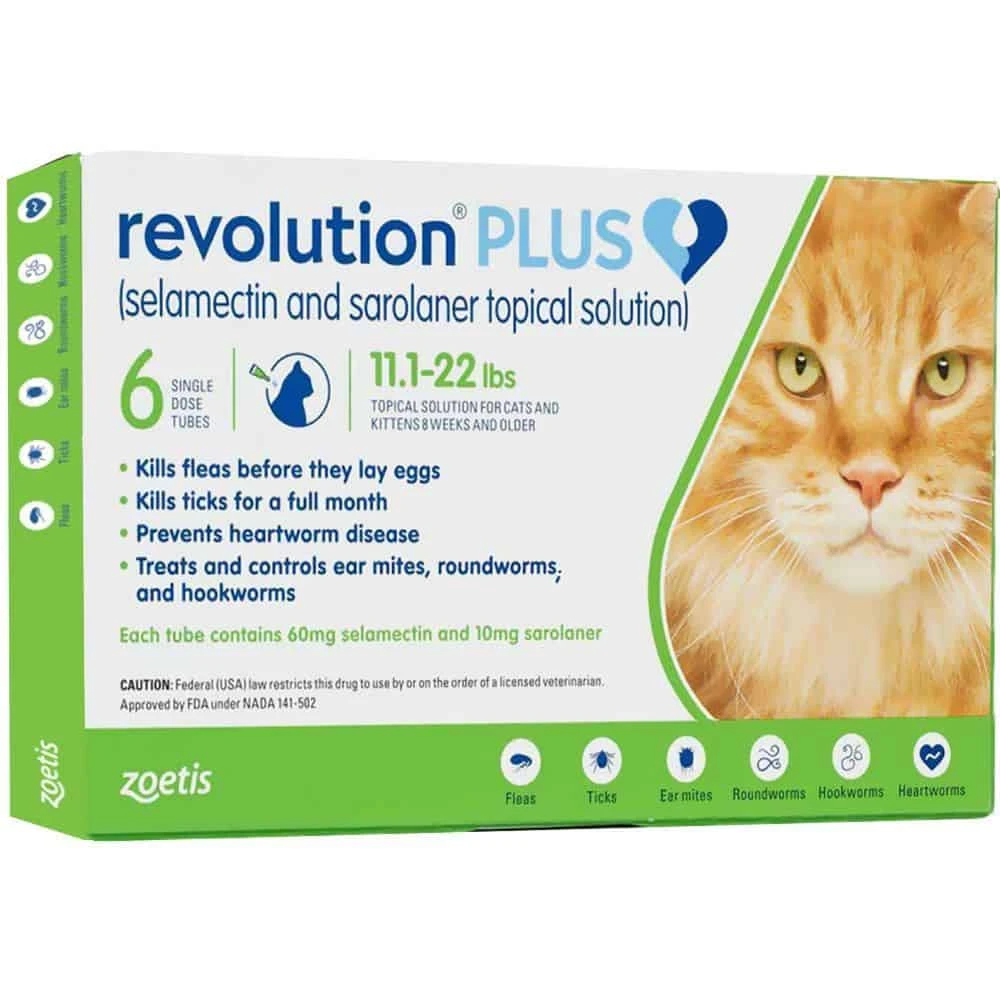 Revolution Plus is a safe and effective monthly topical medication that provides 6-in-1 protection for cats. Revolution Plus kills fleas before they lay eggs, and kills ticks for a full month. In comparison to Revolution for cats, Revolution Plus kills 3 types of ticks (black-legged tick, Gulf Coast tick, and American dog tick) for a full month. It also prevents heartworm disease and treats and controls ear mites, roundworms, and hookworms. Revolution Plus is easy to apply and is a quick-drying solution for a mess-free administration.